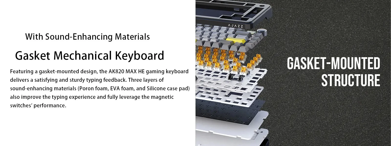 【Superior Build Quality】 The AK820 Max HE features a 75% layout with a multifunctional knob for volume control, customizable with the AJAZZ Driver. The Tri-mode version includes an additional 0.85-inch TFT screen displaying time, battery level, connectivity, and GIFs. The internal structure features a GASKET gasket design and a stiff aluminum plate for stability and sturdy typing feedback, ensuring precise triggering during gaming. Three layers of sound-enhancing materials (Poron foam, EVA foam, and silicone case pad) improve the typing experience and fully leverage the magnetic switches' performance.