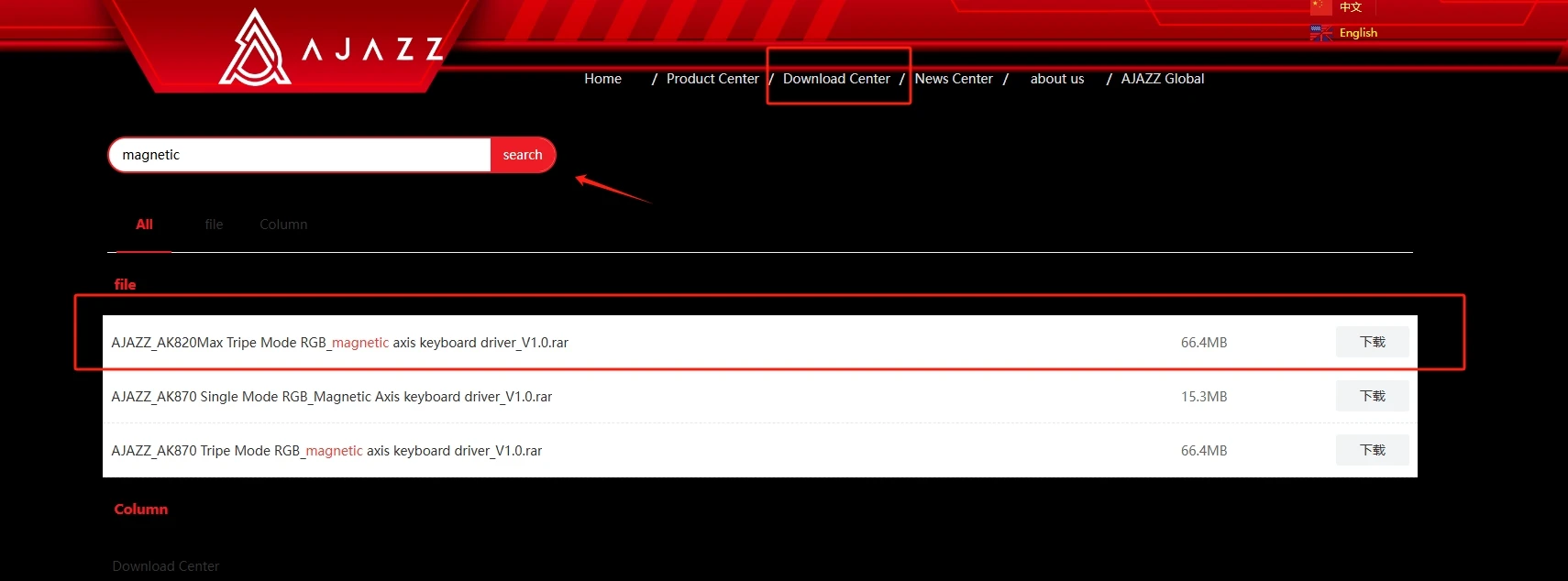 Enter this link and click "Download Center". Then enter "Magnetic" in the search box. According to your keyboard model, select the "three-mode" or "single-mode" driver.