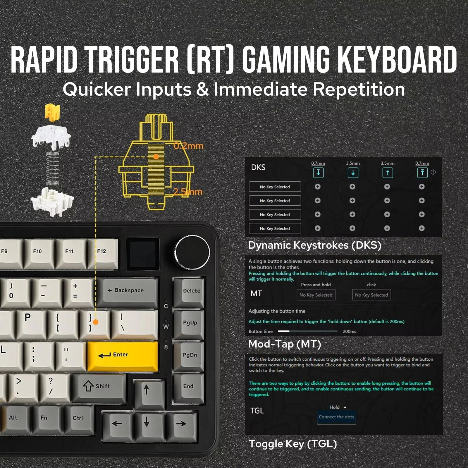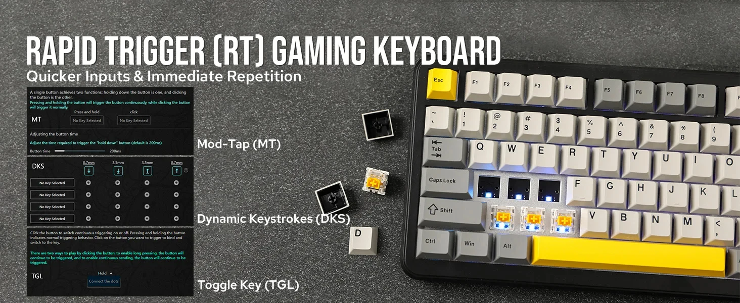 【Rapid Trigger (RT)】 This feature dynamically adjusts the actuation and deactivation points of keys based on the press distance. The RT adjustable range is 0.1 mm to 4 mm for the wired version and 0.2 mm to 2.5 mm for the Tri-mode version. This capability is especially beneficial in gaming, where rapid key presses are crucial. The keyboard reactivates faster than typical mechanical switches, allowing for quicker command inputs and immediate keystroke repetition during intense gaming sessions.