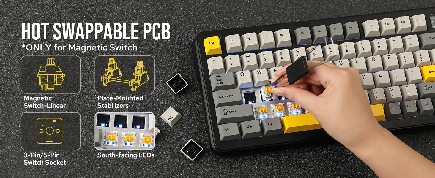 Hot-swappable Magnetic Switches】 The hot-swappable PCB allows users to switch between different magnetic switches, such as Kailh and Gateron, ensuring a customizable keyboard to suit individual preferences.