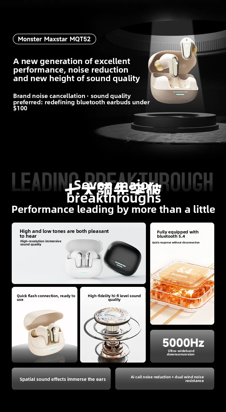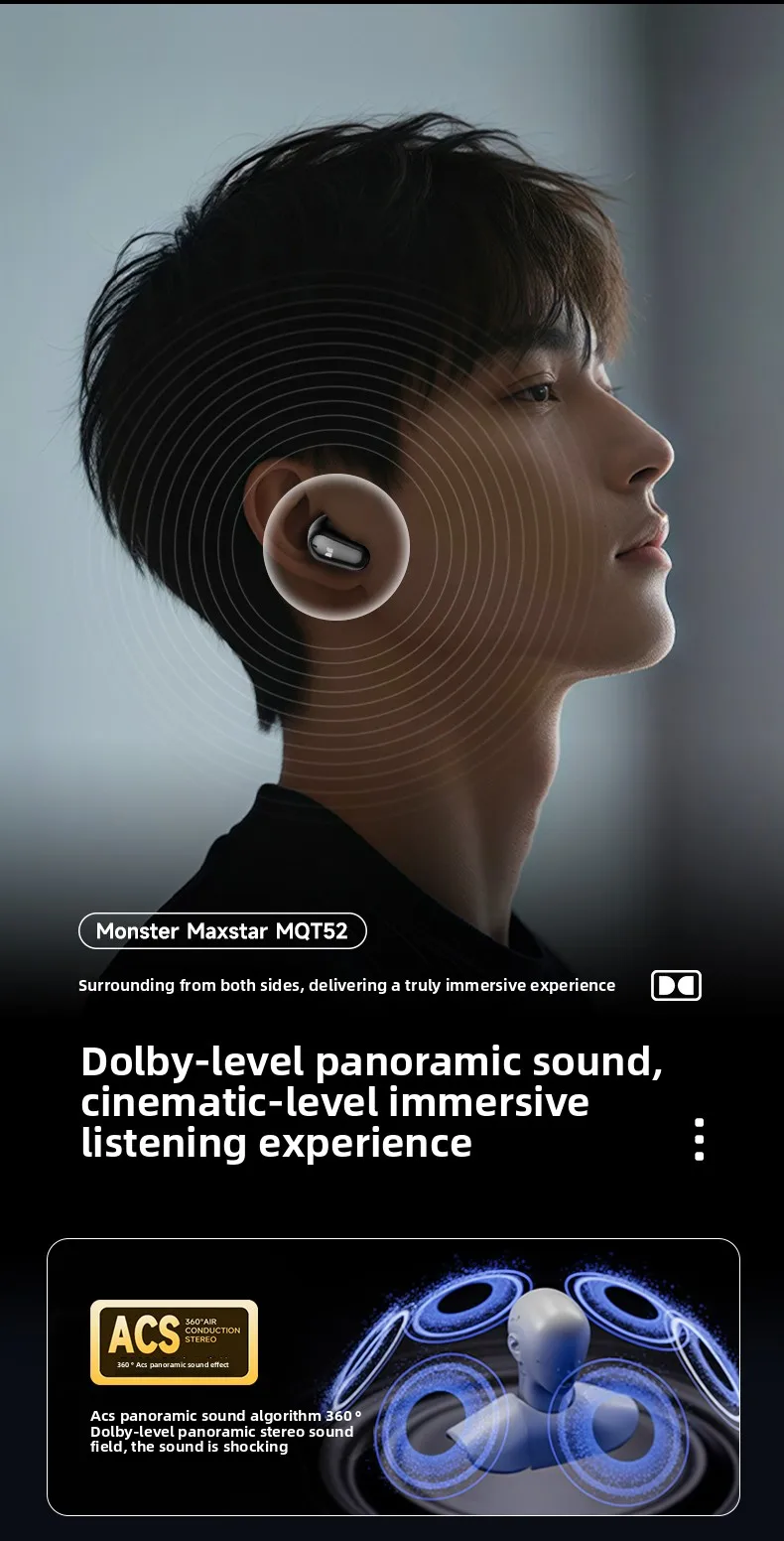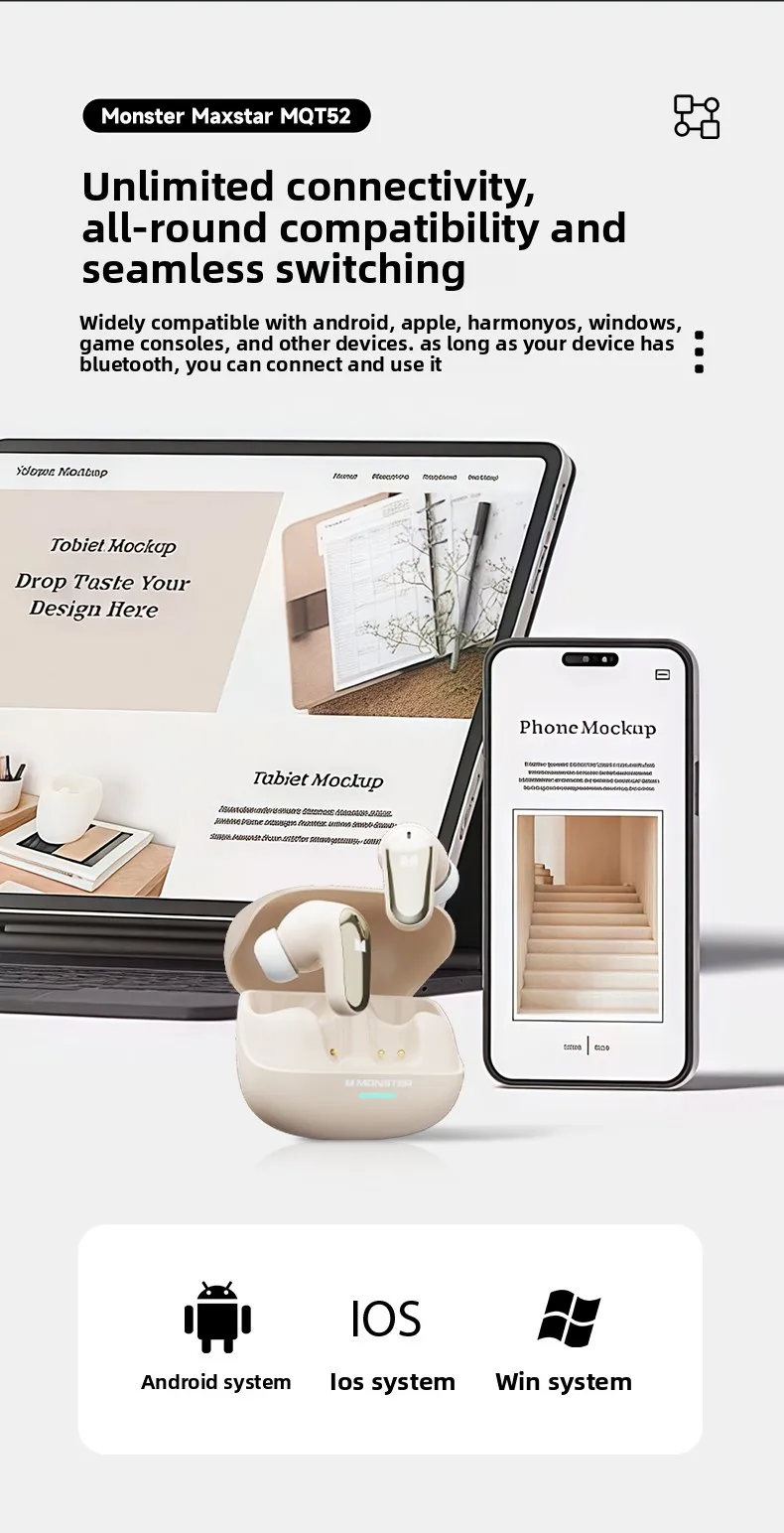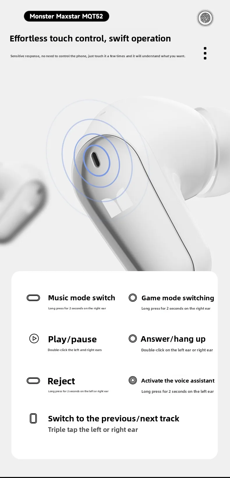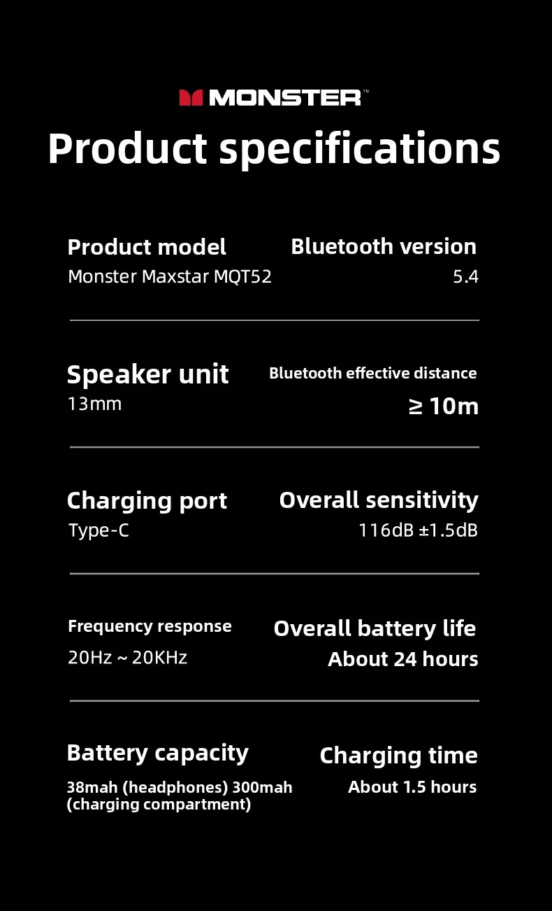 New Monster MQT52 TWS Wireless Bluetooth 5.4 Headset HIFI Stereo Music Gaming Earphones Talking Noise Canceling Earbuds