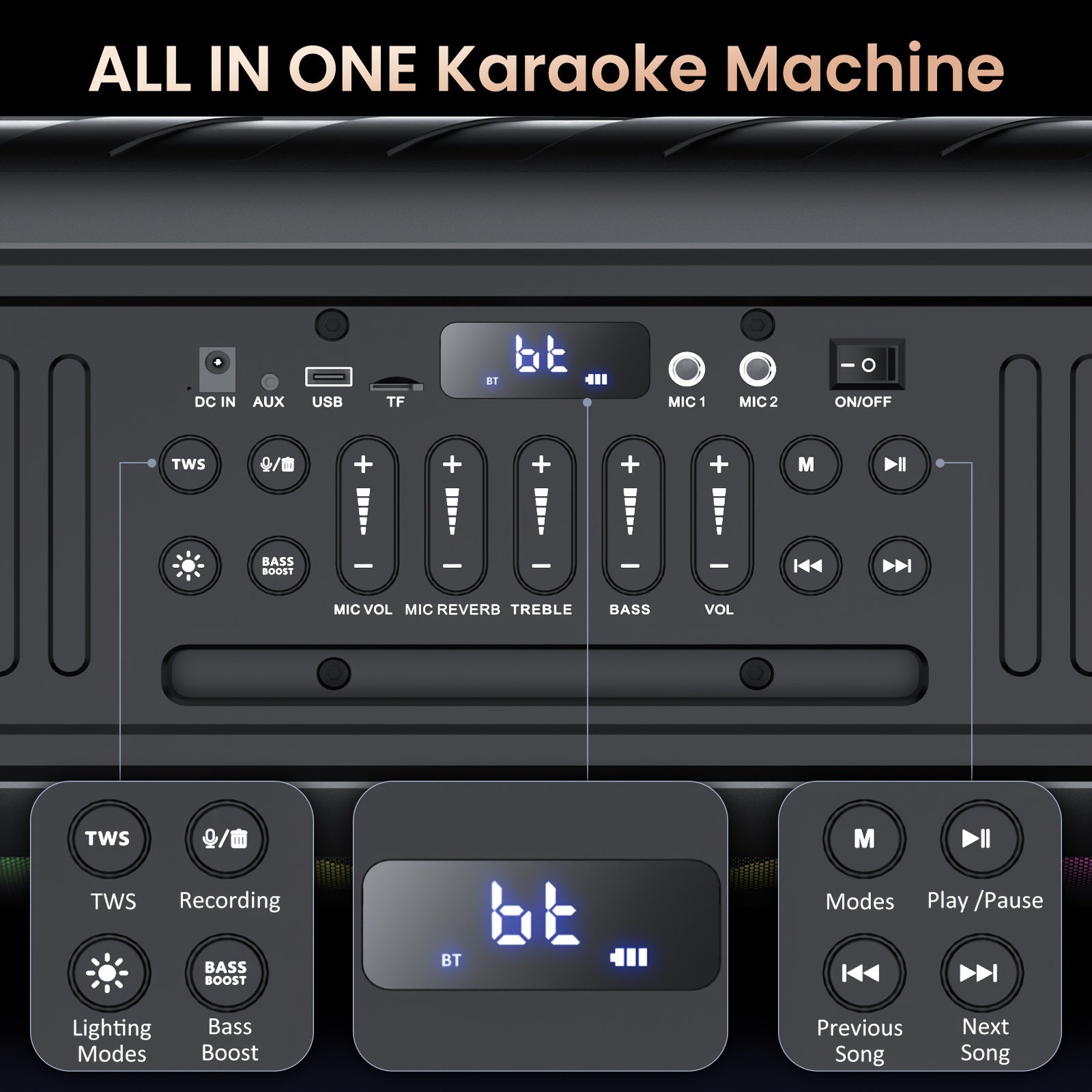 T11-T Bluetooth Karaoke Machine with 2 Wireless Microphones, Beat Light Show, and AUX Input for Home Parties