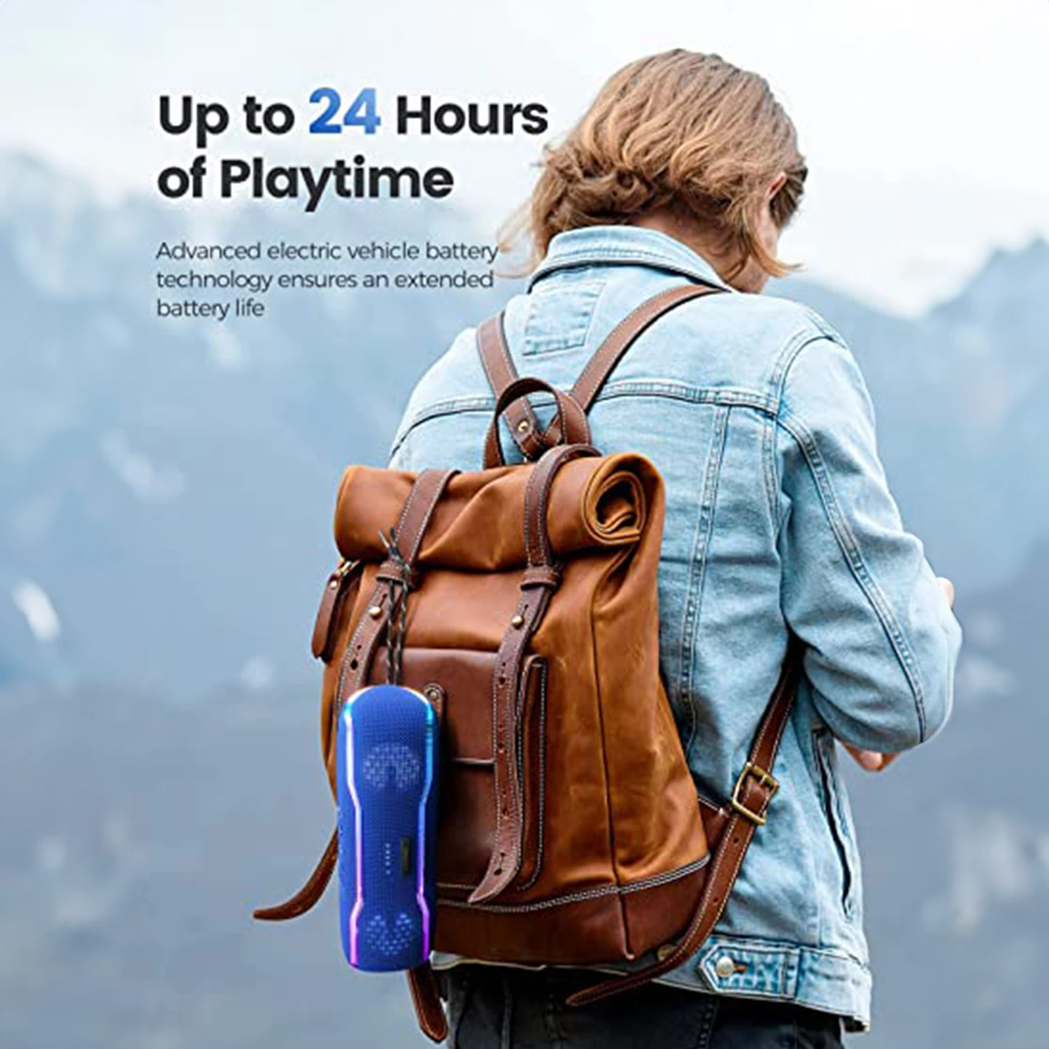- Up to 24 Hours Playtime: Full day of continuous use on a single charge, you can turn on/off the multi-color lights and two hidden speaker lights by tapping the "light button" on the surface to suit your needs and extend Battery Life. Actual playback time varies based on volume level, audio content and usage.
